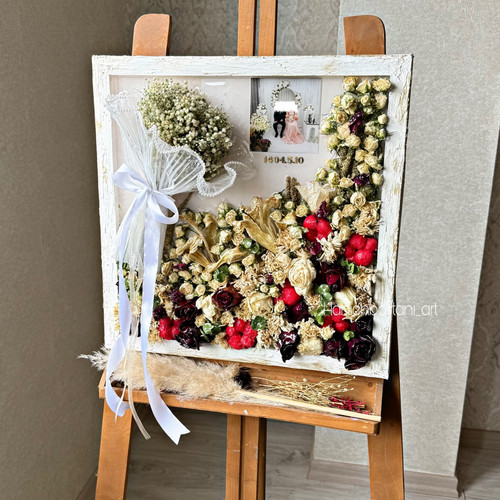 تابلو دیواری رزینی با گل های طبیعی جاودان شده و عکس عروسی