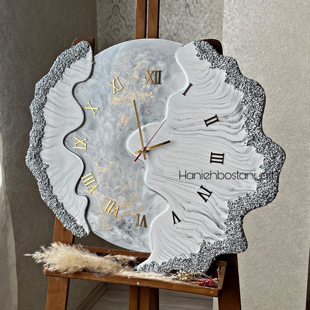 ساعت دیواری طرح دفرمه رزینی سفید ، طوسی و نقره ای