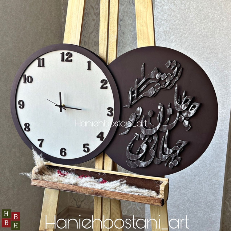 ساعت دیواری ساده با طرح کالیگرافی رنگ کرم و قهوه ای