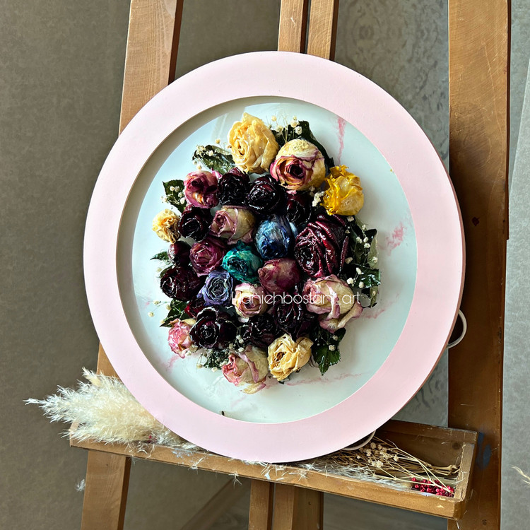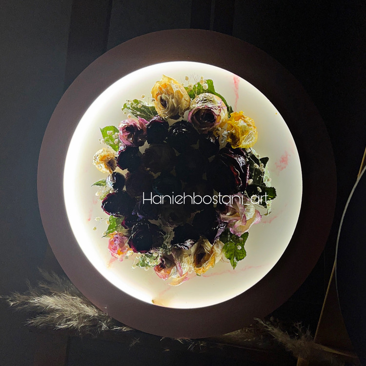 تابلو دیواری رزینی با گل های طبیعی جاودان شده همراه با ریسه نور