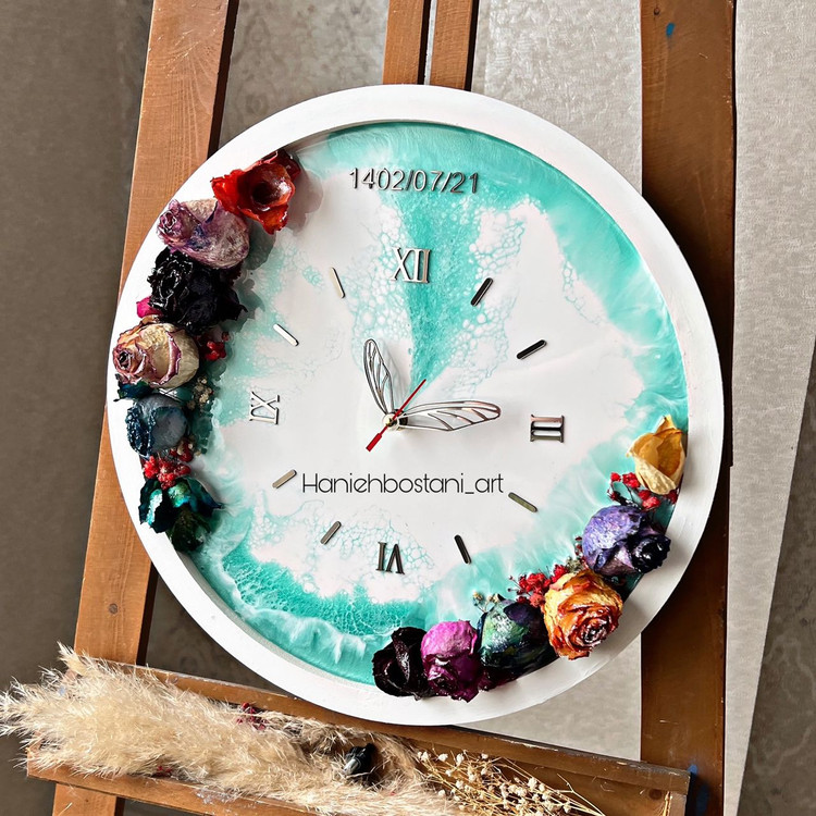 ساعت دیواری رزینی با گل های طبیعی جاودان شده