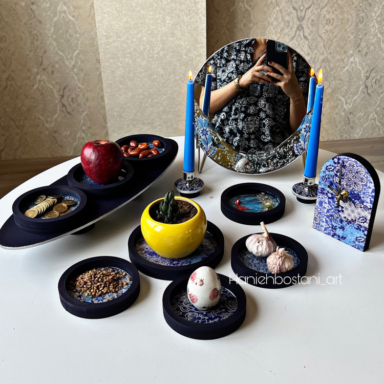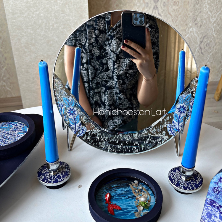 آینه با پایه _دو عدد جاشمعی _ساعت رومیزی_حوض ماهی_جاسبزه _ استند بیضی _ ۶ عدد ظرف هفت سین