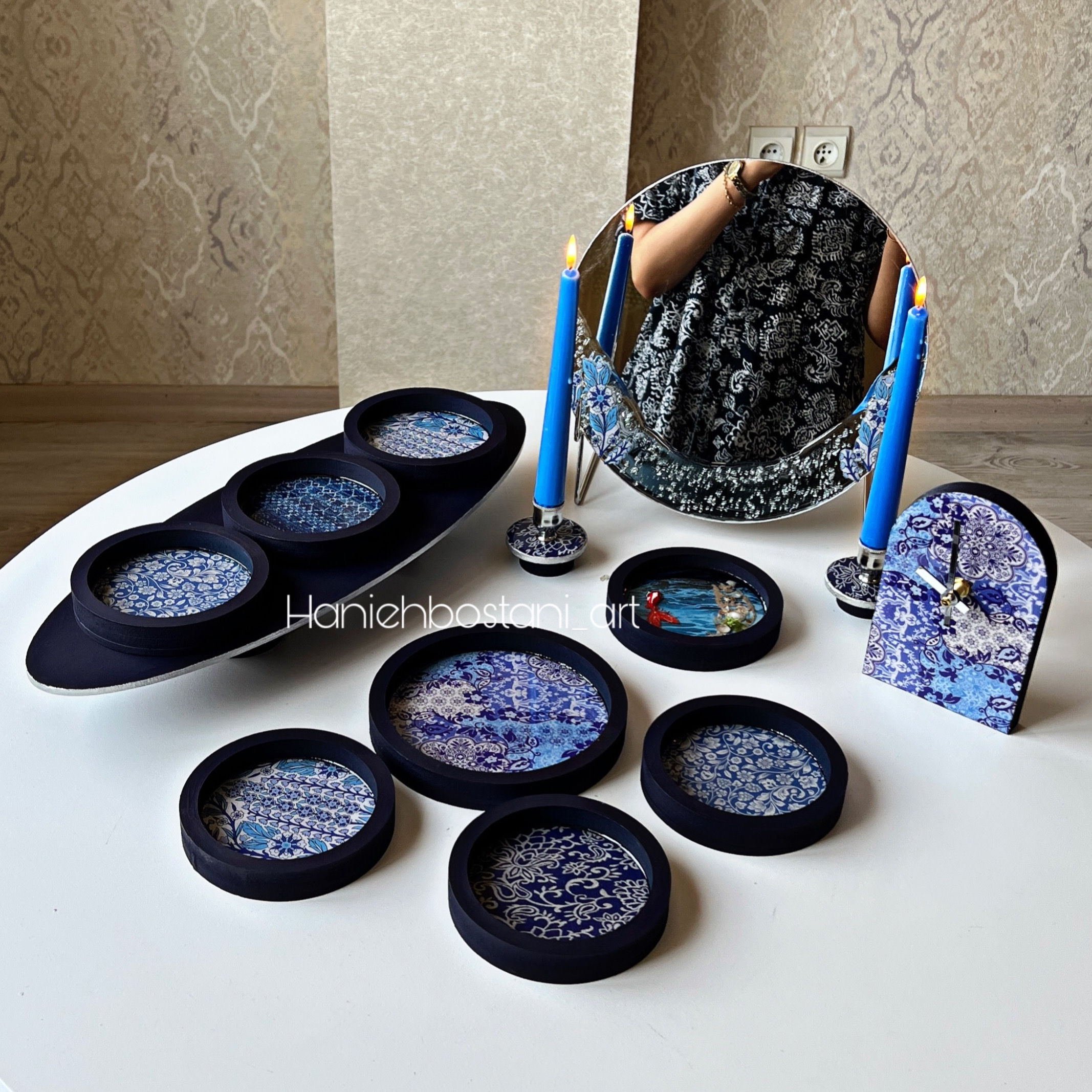 آینه با پایه _دو عدد جاشمعی _ساعت رومیزی_حوض ماهی_جاسبزه _ استند بیضی _ ۶ عدد ظرف هفت سین