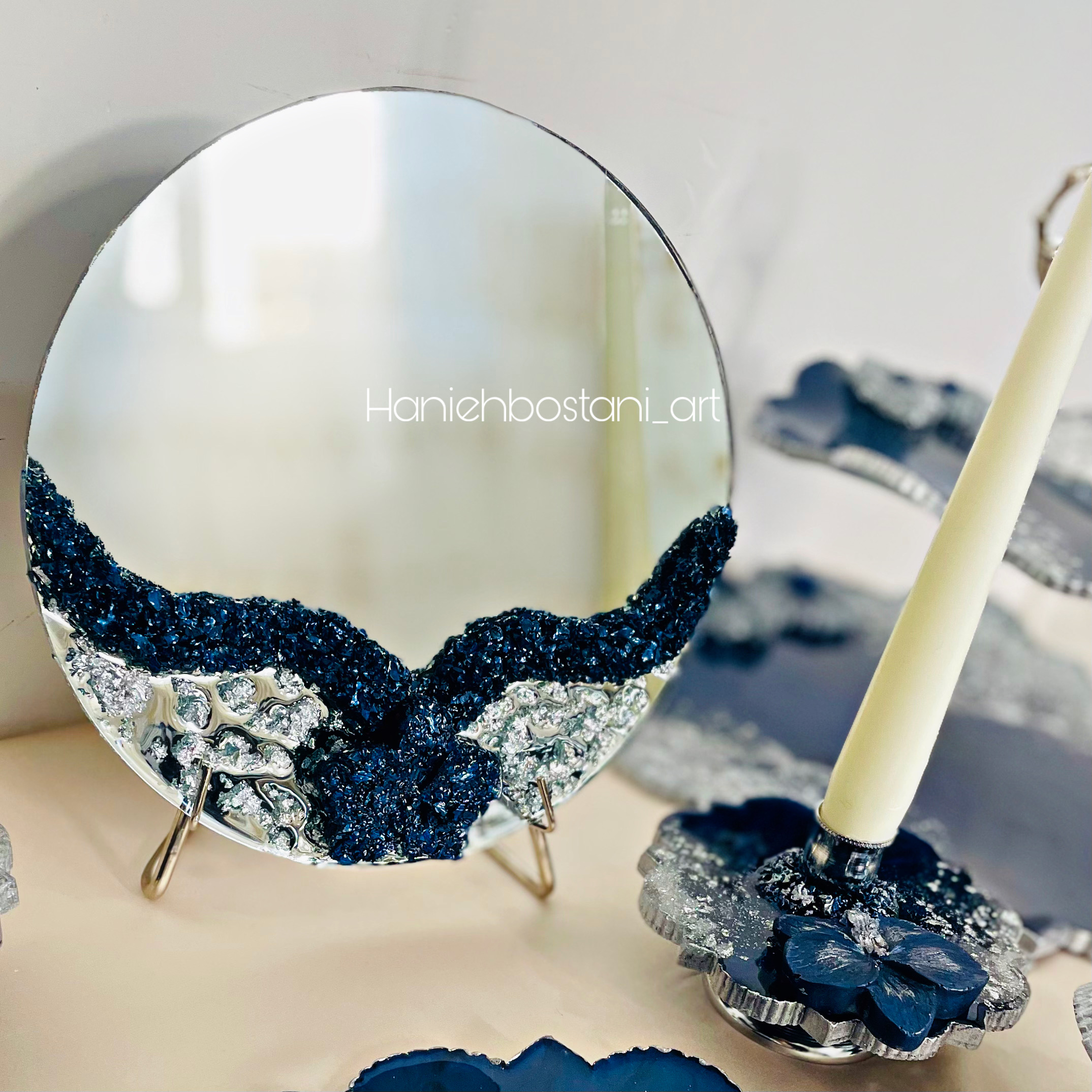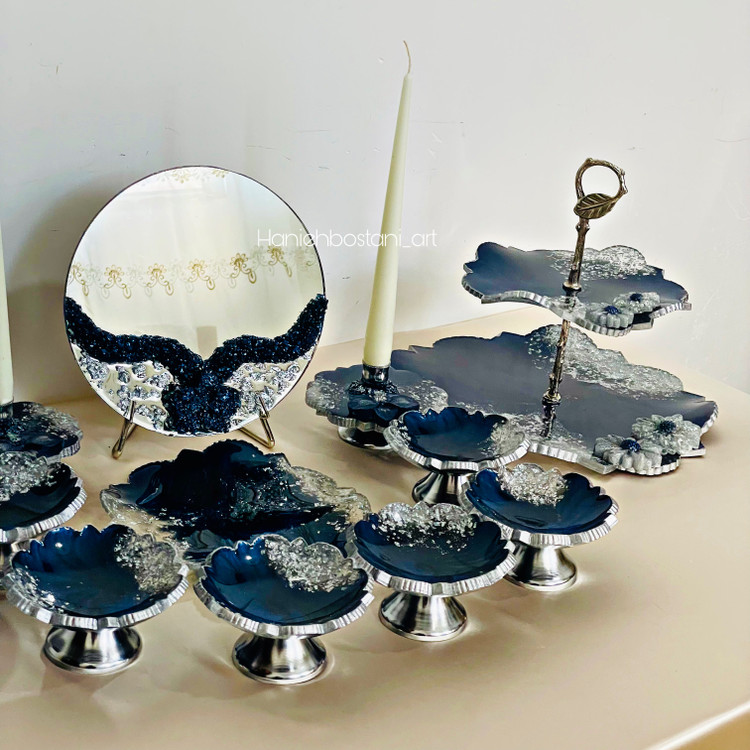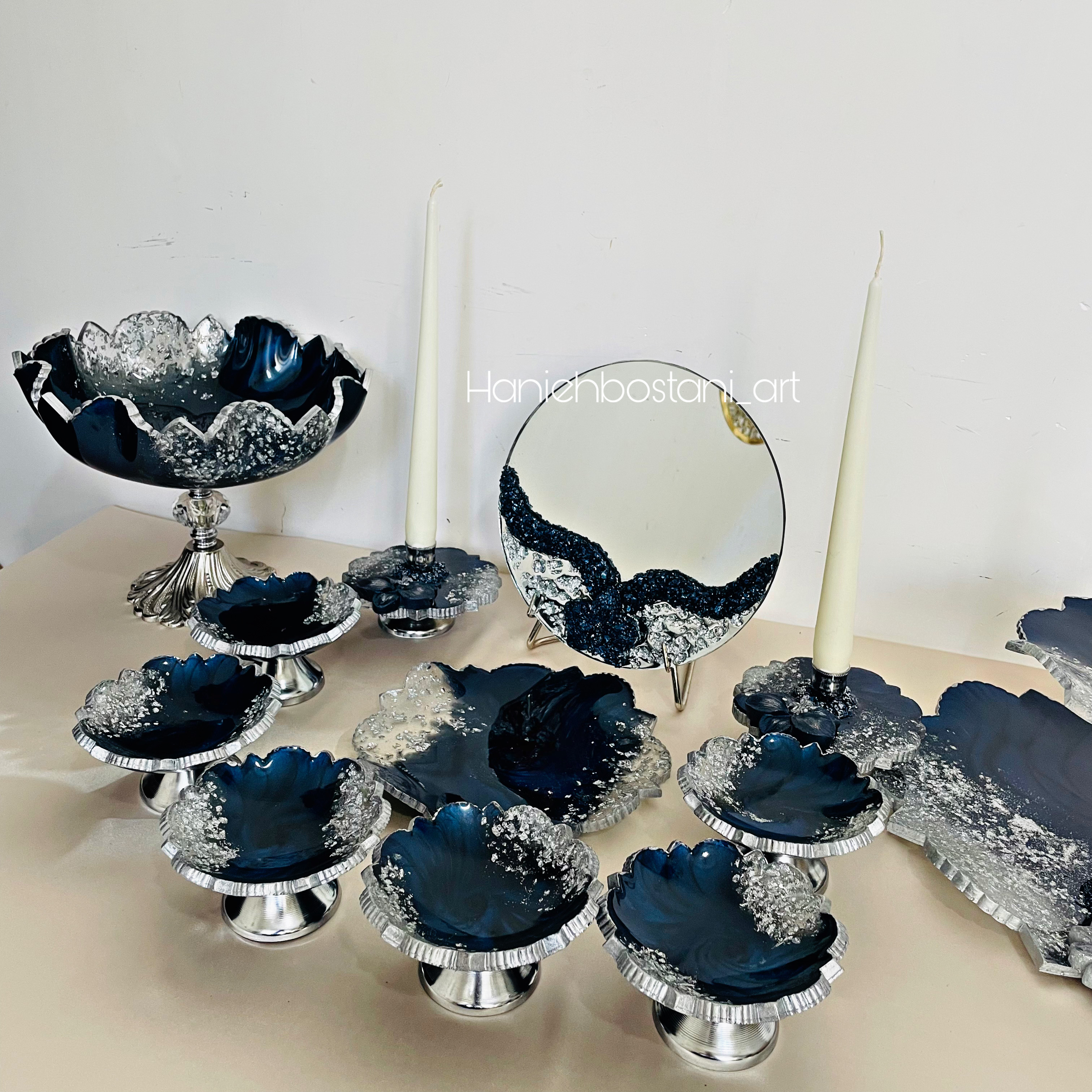 ست شامل موارد زیر هست: ۶ عدد پیاله _ ۲ عدد جاشمعی _جای سبزه _آینه با پایه _آجیل خوری _شیرینی خوری دو طبقه