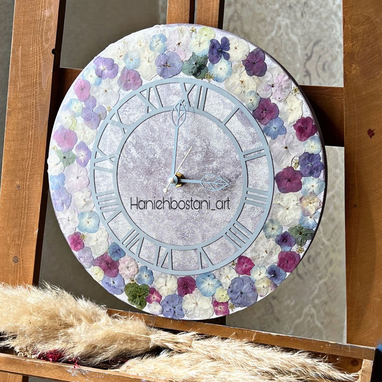 ساعت دیواری رزینی با گل های طبیعی هورتانسیا