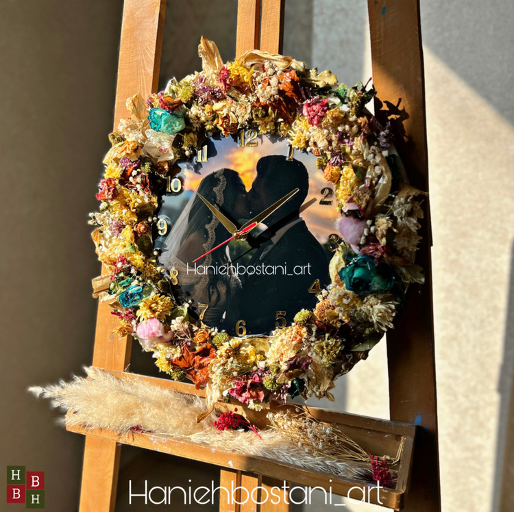 ساعت دیواری رزینی با گل های طبیعی جاودان شده و عکس عروسی